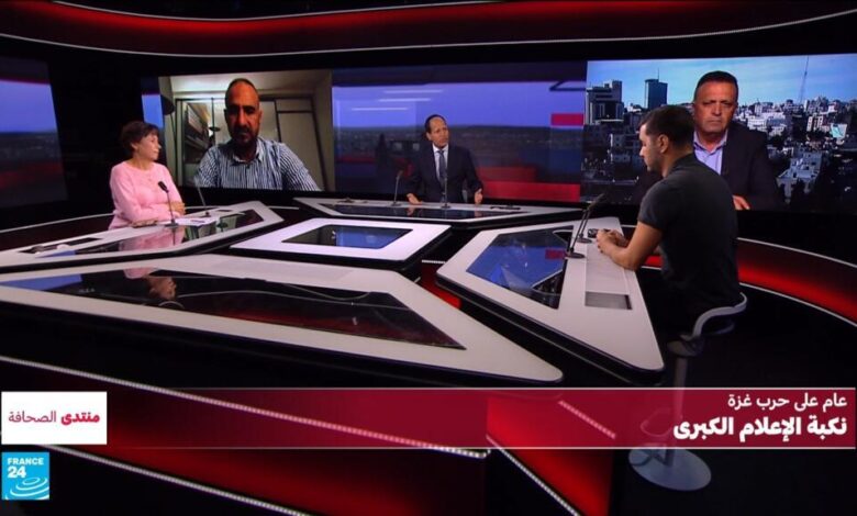 بعد مرور عام على اندلاع الحرب في قطاع غزة والتي أفضت إلى مقتل ما لايقل عن 128 إعلاميا، واعتقال عشرات الإعلاميين وتدمير الكثير من المؤسسات الصحفية داخل القطاع، إضافة إلى منع إسرائيل للإعلام الدولي من دخول القطاع المحاصر ونقل أحداث الحرب وتوثيقها. للحديث عن هذا الموضوع نستضيف في “منتدى الصحافة” الإعلامية وداد العثماني، ونقيب الصحافيين الفلسطنيين أبو بكر ناصر، ومراسل وكالة الصحافة الفرنسية في قطاع غزة عادل الزعنون، ومسؤول قسم الشرق الأوسط بمنظمة “مراسلون بلا حدود” جوناثان داغر.