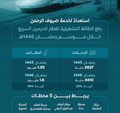 أعلنت الخطوط الحديدية السعودية «سار» عن اكتمال استعداداتها التشغيلية لقطار الحرمين السريع في شهر رمضان المبارك لعام 1446هـ، عبر زيادة كبيرة في عدد الرحلات والمقاعد، بهدف تسهيل تنقل ضيوف الرحمن بين مكة المكرمة والمدينة المنورة، وتوفير تجربة سفر أكثر راحة وانسيابية.