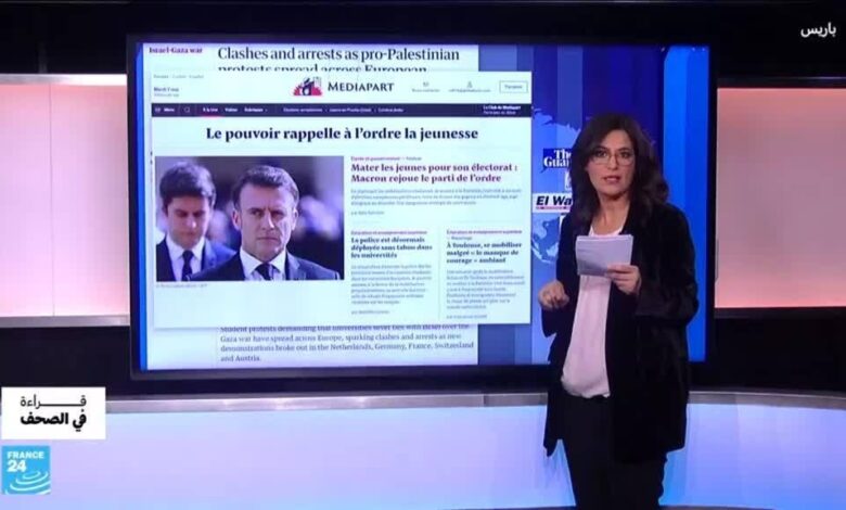 في الصحف اليوم: الهجوم الإسرائيلي على رفح والاحتجاجات الطلابية المؤيدة لغزة والتي بدأت تنتشر في العديد من الجامعات الأمريكية والأوروبية. في الصحف أيضا: تخليد الجزائر لليوم الوطني للذاكرة، ووصول الشعلة الأولمبية إلى مدينة مرسيليا قادمة من اليونان، وهزيمة نادي باريس سان جيرمان البارحة أمام نادي بوروسيا دورتموند برسم إياب نصف نهائي دوري أبطال أوروبا.