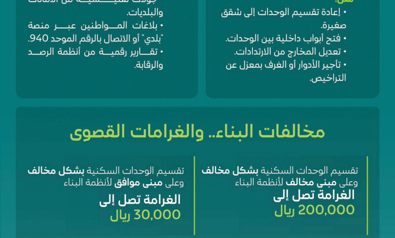 أكدت وزارة البلديات والإسكان استمرار الأمانات والبلديات برصد ومعالجة مخالفات تقسيم المساكن المعدّة للاستثمار غير المرخصة، مشددة على التصدي للممارسات غير النظامية التي تتم دون الحصول على التراخيص البلدية المعتمدة، لما لذلك من أثر سلبي على جودة الحياة والنسيج