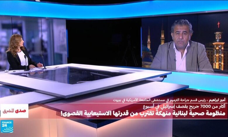 في “صدى المشرق” تستضيف رجاء مكي، رئيس قسم جراحة الترميم في مستشفى الجامعة الأمريكية في بيروت أمير ابراهيم. لتسليط الضوء على الحصيلة الثقيلة من الجرحى اللبنانيين، حيث سقط أكثر من 7000 جريح بقصف إسرائيلي في أسبوع، لكن ما الذي يمكن القيام به في ظل منظومة صحية لبنانية منهكة؟ وكيف يتعامل القطاع الصحي مع هذا العدد الهائل من الجرحى؟