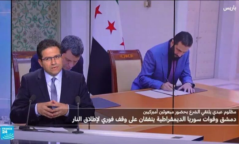 قالت وزارة الدفاع السورية إن الوزير مرهف أبو قصرة وقائد قوات سوريا الديمقراطية مظلوم عبدي اتفقا على “وقف شامل لإطلاق النار بكافة المحاور ونقاط الانتشار العسكرية شمال وشمال شرق سوريا”. وأضافت الوزارة أن تنفيذ الاتفاق يبدأ على الفور. وجاء الاتفاق عقب لقاء جمع قائد قوات سوريا الديموقراطية مظلوم عبدي مع الرئيس الانتقالي أحمد الشرع في دمشق، غداة اشتباكات بين قوات حكومية وأخرى كردية في مدينة حلب أسفرت عن مقتل شخصين.