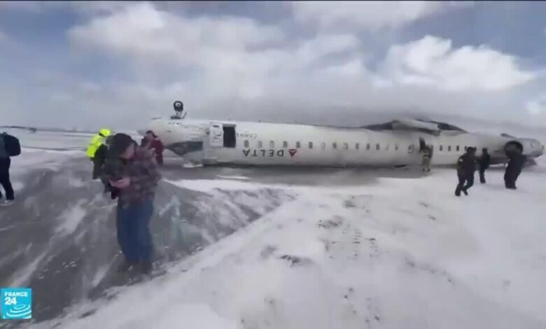 إصابة 18 راكبا في انقلاب طائرة أمريكية أثناء هبوطها بمطار تورونتو في كندا
