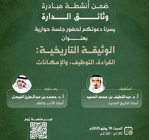 تقيم دارة الملك عبدالعزيز يوم السبت 19 يوليو في تمام الساعة 1.30 ظهرًا، عبر منصة «زووم»، جلسة حوارية بعنوان: «الوثيقة التاريخية: القراءة، التوظيف، والإمكانات» يتحدث فيها أ.د.عبداللطيف الحميد، ويحاوره أ.د.محمد الفيصل أستاذ الأدب والنقد بجامعة الإمام، ومدير تحرير صحيفة