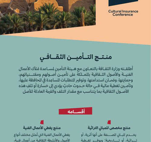 تُنظم وزارة الثقافة بالتعاون مع هيئة التأمين، الثلاثاء القادم، مؤتمر التأمين الثقافي، في قصر الثقافة بحي السفارات في مدينة الرياض، وذلك للتعريف بمنتج التأمين الثقافي الذي أُطلق مؤخراً لمساعدة مُلاّك الأعمال الفنية والأصول الثقافية بالمملكة على تأمين أصولهم ومقتنياتهم، وحمايتها،