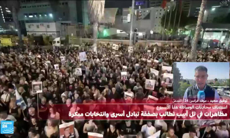 تظاهر آلاف الإسرائيليين السبت في تل أبيب لمواصلة الضغط على حكومة نتانياهو في قضية الرهائن المحتجزين لدى حماس. وأعلنت الحركة الفلسطينية أن “مقاتليها نفذوا السبت كمينا ضد قوة إسرائيلية شمالي قطاع غزة وأوقعوا أفرادها “بين قتيل وجريح وأسير”. عن أثر هذا الإعلان على الرأي العام الإسرائيلي والغضب الشعبي المتصاعد ضد نتانياهو في قضية الرهائن يتحدث موفد فرانس24 توفيق مجيد.