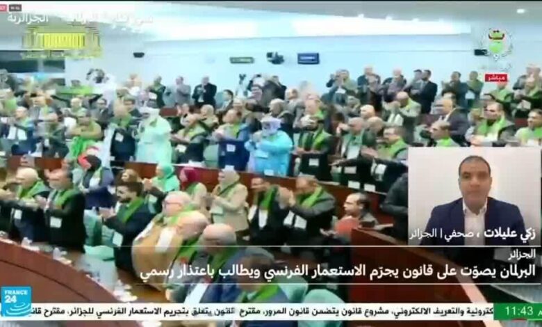 صادق البرلمان الجزائري بالإجماع الأربعاء على قانون يجرّم الاستعمار الفرنسي للجزائر (1830-1962) ويصفه بأنه “جريمة دولة” ويطالب فرنسا بـ”اعتذار رسمي”، في وقت تشهد العلاقات الدبلوماسية بين البلدين أزمة كبرى.