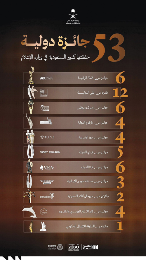 حققت مبادرة «كنوز السعودية» إحدى مبادرات وزارة الإعلام، إنجازًا عالميًّا بفوزها بست جوائز ذهبية في جوائز الفنون السمعية والبصرية الرقمية (AVA)، عن فيلمها الوثائقي «الوجهة» وذلك في مسارات؛ الوثائقيات، والأفلام، والتحرير، والمعلومات، والتصوير الفوتوغرافي، والإخراج، ليصل عدد