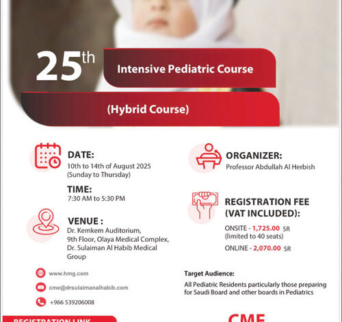 تنظم مجموعة الدكتور سليمان الحبيب الطبية، وللعام الخامس والعشرين على التوالي الدورة المكثفة الخامسة والعشرين لطب الأطفال، والمعتمدة من الهيئة السعودية للتخصصات الصحية، وذلك خلال الفترة من 10 إلى 14 أغسطس 2025 م، بقاعة الدكتور محمد كمكم بالمجمع الطبي بالعليا.