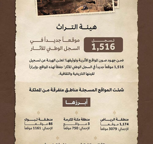 أعلنت هيئة التراث، تسجيل (1516) موقعًا أثريًا جديدًا في السجل الوطني للآثار؛ ليرتفع عدد المواقع المسجلة في السجل إلى (11,577) موقعًا، التي تعكس في مجموعها غنى التراث السعودي وتنوعه، وتأتي هذه الإضافة امتدادًا لجهود الهيئة المتواصلة لتوثيق المواقع الأثرية بالمملكة وصونها.