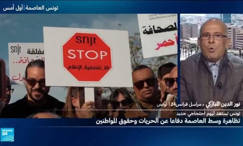 خرجت السبت “مسيرة ضد الظلم” وسط العاصمة التونسية للتنديد بسجن معارضين وللدفاع عن الحقوق والحريات. فيما تظاهر عشرات من الصحافيين التونسيين الخميس تنديدا باستهداف حرية الاعلام والتعبير، متهمين السلطات بشن حملة “غير مسبوقة” منذ الثورة التي شهدتها البلاد العام 2011.