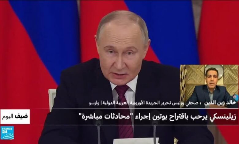 اقترح الرئيس الروسي فلاديمير بوتين إجراء مفاوضات مباشرة مع أوكرانيا خلال الأيام المقبلة لإنهاء الحرب، متجاهلا الرد على مقترح أوكراني أوروبي يحظى بمباركة أميركية لوقف إطلاق النار لمدة 30 يوما. فما هي  رسائل بوتين من هذا الاقتراح، هل هي مبادرة جادة للسلام أم مجرد محاولة لكسب الوقت؟ للحديث عن هذا الموضوع نستضيف الصحفي ورئيس تحرير الجريدة الأوروبية العربية الدولية خالد زين الدين.