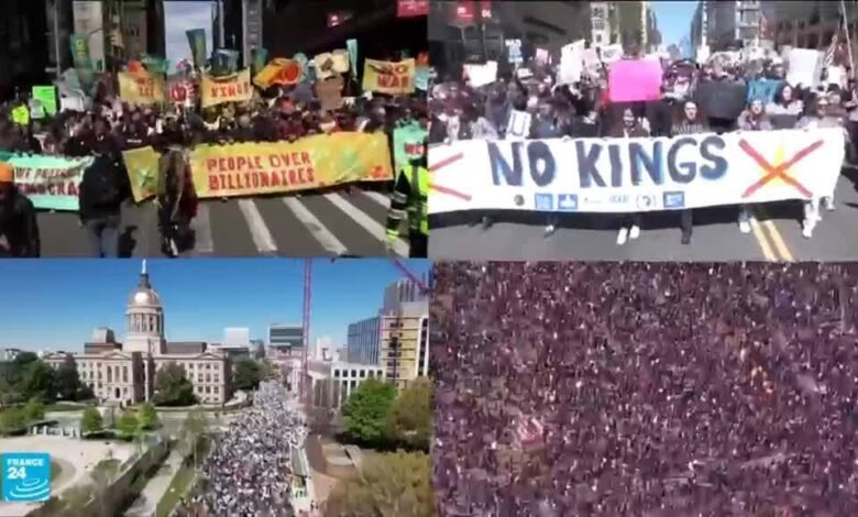 شاركت حشود من المحتجين في تظاهرات واسعة النطاق ضد الرئيس الأميركي دونالد ترامب في مدن عدة في الولايات المتحدة السبت، وذلك رفضا لسياساته من النزعة السلطوية الى الحملة على الهجرة، وصولا للحرب في الشرق الأوسط.وأعلنت حركة “لا ملوك” المنظمة للتجمعات التي شملت مناطق في مختلف أنحاء البلاد، أنها حشدت ثمانية ملايين متظاهر على الأقل، في رقم قياسي.