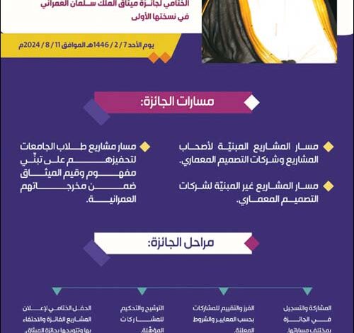 تشهد العاصمة الرياض تحت رعاية خادم الحرمين الشريفين الملك سلمان بن عبدالعزيز آل سعود -حفظه الله-، مساء اليوم الأحد الحفل الختامي لجائزة ميثاق الملك سلمان العمراني في نسختها الأولى بتنظيم هيئة فنون العمارة والتصميم، ضمن جهود الهيئة لتكون الجائزة جزءاً من إستراتيجية تفعيل مبادرة