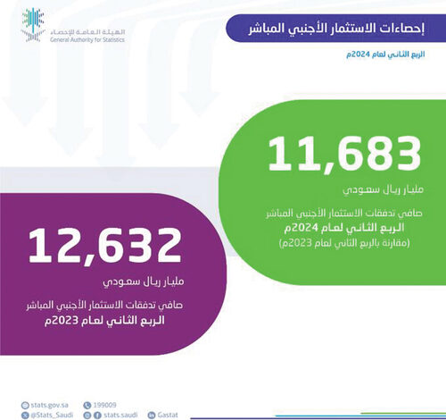 كشفت الهيئة العامة للإحصاء عن نمو صافي تدفقات الاستثمار الأجنبي المباشر في المملكة بنسبة 23.4% خلال الربع الثاني من 2024 مقارنة بالربع السابق من العام نفسه؛ إذ بلغت 9.5 مليار ريال، لكنها بلغت 11.7 مليار ريال منخفضة بنسبة 7.5% مقارنة بالربع المماثل من العام الماضي،
