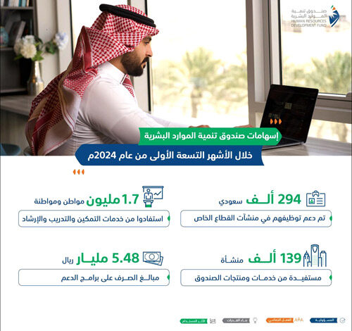 كشف مدير عام صندوق تنمية الموارد البشرية الأستاذ تركي بن عبدالله الجعويني، عن مساهمة الصندوق في دعم توظيف نحو 294 ألف مواطن ومواطنة للعمل في منشآت القطاع الخاص، خلال الأشهر التسعة الأولى من العام الجاري 2024م، واستفادة 1,7 مليون مواطن ومواطنة من كافة برامج ومنتجات الصندوق،