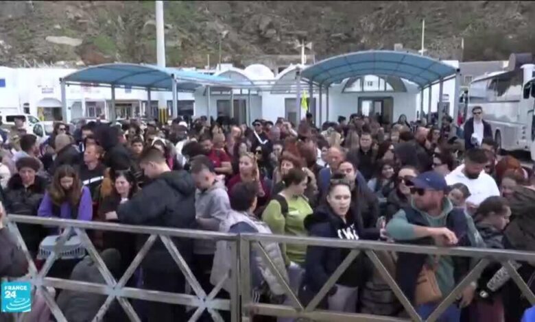 تجمع مئات الأشخاص في أحد موانئ سانتوريني في الساعات الأولى من صباح اليوم الثلاثاء لركوب عبارة تصل بهم إلى بر الأمان في أثينا في خضم سلسلة من الزلازل المستمرة في الجزيرة التي تعد أحد أبرز الوجهات السياحية اليونانية.
