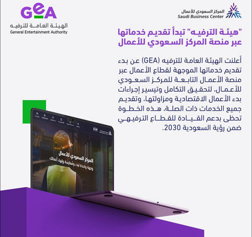 أعلنت الهيئة العامة للترفيه (GEA) عن بدء تقديم خدماتها الموجهة لقطاع الأعمال، عبر منصة الأعمال التابعة للمركز السعودي للأعمال؛ في خطوة تهدف إلى تحقيق التكامل مع المركز الذي يُعنى بتيسير إجراءات بدء الأعمال الاقتصادية، ومزاولتها، وتقديم جميع الخدمات ذات الصلة بها، وفقًا لأفضل