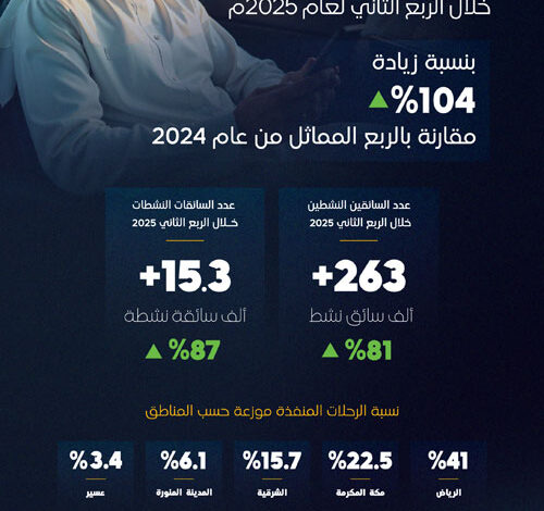 كشفت الهيئة العامة للنقل، اليوم، عن عدد الرحلات المنفذة عبر تطبيقات نقل الركاب، التي بلغت أكثر من (32) مليون رحلة خلال الربع الثاني من عام 2025، مسجلة ارتفاعًا بلغ (104 في المائة) مقارنة بالربع المماثل من العام الماضي.