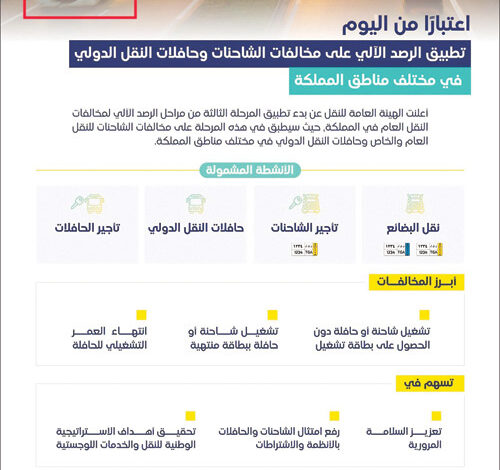 أعلنت الهيئة العامة للنقل امس، عن بدء تطبيق المرحلة الثالثة من مراحل الرصد الآلي لمخالفات النقل العام، والتي ستشمل في هذه المرحلة على الشاحنات في النقل العام والخاص، إضافة لحافلات النقل الدولي، وذلك في مختلف مناطق المملكة.