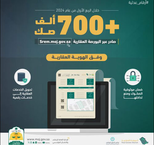 أعلنت وزارة العدل عن إصدار أكثر من 700 ألف صك عبر البورصة العقارية وفق الهوية العقارية، خلال الربع الأول من العام الجاري 2024م.