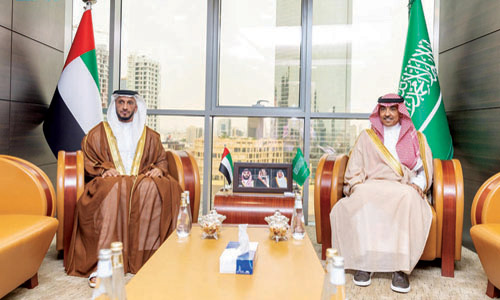 استقبل معالي وزير الإعلام الأستاذ سلمان بن يوسف الدوسري في مكتبه بمقر «واس» في الرياض أمس، معالي رئيس المكتب الوطني للإعلام بدولة الإمارات العربية المتحدة الشيخ عبدالله بن محمد آل حامد، يرافقه عدد من المسؤولين.