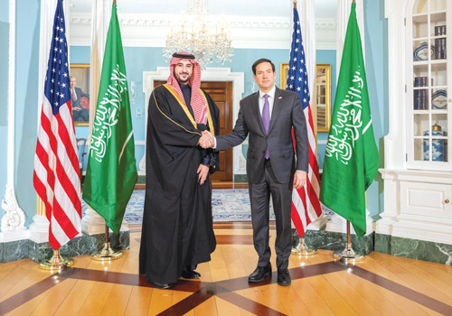 التقى صاحب السمو الملكي الأمير خالد بن سلمان بن عبدالعزيز وزير الدفاع، في مقر وزارة الخارجية الأمريكية بالعاصمة واشنطن معالي وزير الخارجية الأمريكي ماركو روبيو.وقبل بداية اللقاء دوّن سموه في سجل الزيارات الرسمية كلمة بهذه المناسبة.وجرى خلال اللقاء استعراض العلاقات التاريخية