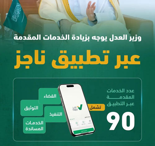 وجه معالي وزير العدل الدكتور وليد بن محمد الصمعاني، بزيادة الخدمات المقدمة عبر تطبيق «ناجز» للأجهزة الذكية؛ ليصبح الإجمالي 90 خدمة عدلية؛ تشمل جميع القطاعات العدلية.