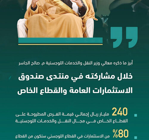 أكد معالي وزير النقل والخدمات اللوجستية المهندس صالح بن ناصر الجاسر، أن القطاع الخاص يمثل شريكا أساسيا في أعمال منظومة النقل والخدمات اللوجستية، حيث تتصاعد وتتعزز مع مرور الوقت، مبينا أن مستهدفات الاستثمارات في قطاع النقل والخدمات اللوجستية تصل نسبته إلى 80 في المائة، عبر