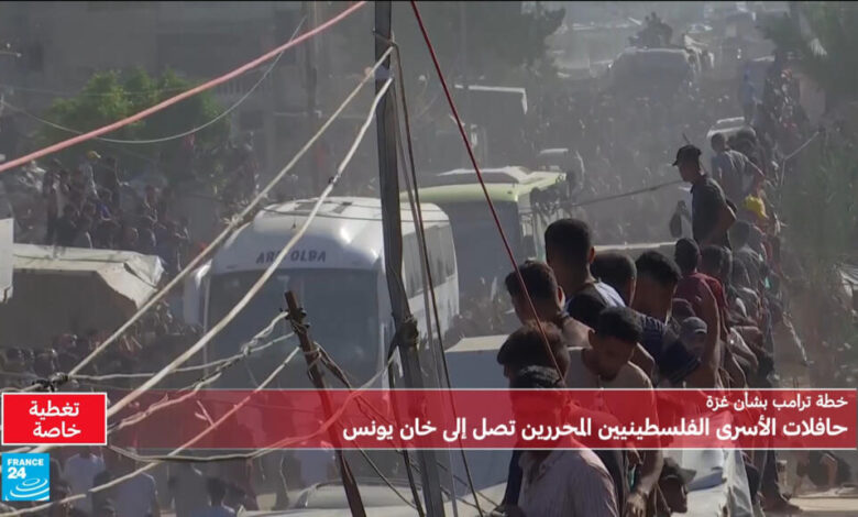 وصلت عدة حافلات تقلّ معتقلين فلسطينيين أفرجت عنهم إسرائيل مقابل الرهائن الذين أفرجت عنهم حماس في وقت سابق من الاثنين إلى خان يونس جنوب قطاع غزة، حسبما أفاد مراسل فرانس برس.   وتجمعت حشود غفيرة من الفلسطينيين لاستقبال المعتقلين والترحيب بهم، وشرع الكثيرون في التكبير بينما هلَّل آخرون وصفَّروا وصفقوا وعلت حناجرهم بالهتاف.
