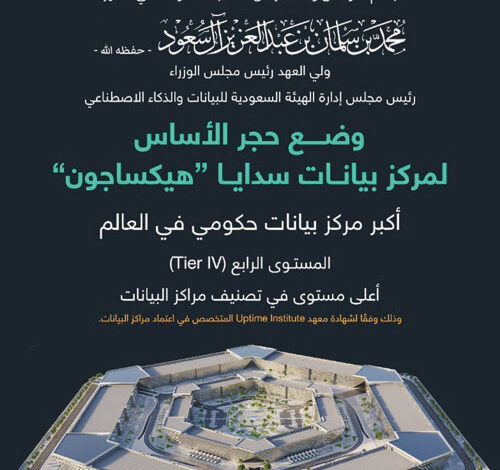 وُضع الخميس حجر الأساس لإنشاء مركز بيانات سدايا «هيكساجون» الذي يعد أكبر مركز بيانات حكومي في العالم مصنف Tier IV، ويمتلك أعلى مستوى تصنيف لمراكز البيانات حسب معهد الجهوزية العالمي «Uptime Institute»، بطاقة استيعابية إجمالية تقدر بـ480 ميجاواط، وسيتم إنشاؤه على مساحة تتجاوز