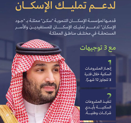قدّم صاحب السمو الملكي الأمير محمد بن سلمان بن عبدالعزيز آل سعود ولي العهد رئيس مجلس الوزراء -حفظه الله-، تبرعًا سخيًا بمبلغ مليار ريال – على نفقة سموه الخاصة- لمؤسسة الإسكان التنموي الأهلية (سكن) ممثلة بـ(جود الإسكان)؛ بهدف دعم تمليك الإسكان للمُستفيدين والأسر المستحقة، وذلك