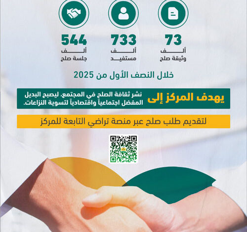أصدر مركز المصالحة التابع لوزارة العدل (73 ألف) وثيقة صلح خلال النصف الأول من العام الجاري 2025م؛ مما يعكس جهود المركز في تعزيز ثقافة التسوية الودية وحل النزاعات خارج أروقة المحاكم.