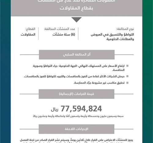 أصدرت الهيئة العامة للمنافسة عقوبات ضد 6 منشآت في قطاع المقاولات تتضمن غرامات مالية بلغت 77.594.824 ريالا ( سبعة وسبعين مليونا وخمس مئة وأربعة وتسعين ألفاً وثمانمائة وأربعة وعشرين ريالا).
