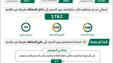 أسفرت الحملات الميدانية المشتركة لمتابعة وضبط مخالفي أنظمة الإقامة والعمل وأمن الحدود، التي تمت في مناطق المملكة كافة، وذلك للفترة…